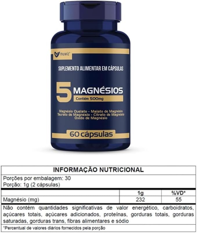5 Magnésios da Muwiz, como o próprio nome já diz, é composto por 5 tipos de magnésios. Auxilia na formação de ossos e dentes, no metabolismo energético e no metabolismo de proteínas, carboidratos e gorduras.