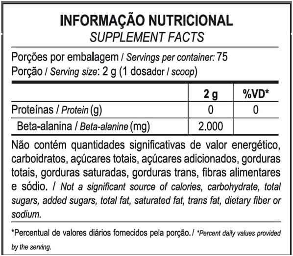 Beta-Alanina (150g) Durante a prática de exercícios de elevada intensidade, acontece grande produção e acúmulo de ácido (H+) nos músculos, sendo essa uma das principais causas da fadiga muscular, ou seja, aquela sensação de ?queimação? e cansaço no músculo. A Carnosina muscular, que é então formada pela ligação entre a Beta Alanina e Histidida, é capaz de neutralizar esses ácidos, ajudando q diminuir a fadiga muscular. Sendo a síntese de carnosina limitada pela disponibilidade de beta-alanina, a suplementação desse aminoácido é uma ótima opção para auxiliar a manter o nível dos seus treinos sempre intenso! A Beta Alanina é um aminoácido não proteogênico, ou seja, ela não participa das vias de síntese proteica. Sua principal função é o aumento de Carnosina Muscular, formada pelos aminoácidos Beta Alanina + Histidina. Este é um suplemento de alta evidência científica, recomendado pelas principais organizações, como o Comitê Olímpico Internacional, para o desempenho de atletas. Uma curiosidade sobre a Beta Alanina é que ela causa um efeito muito conhecido, denominado parestesia. A parestesia é a sensação de formigamento/pinicar, que acontece geralmente no rosto, pescoço e braços, quando há consumo de doses maiores ou iguais à 2 g. Este não é um efeito prejudicial! Benefícios: – 2g Beta Alanina, por porção;- Zero glúten, zero lactose e zero sódio;- Mais resistência;- Aumento de Carnosina Muscular;- Neutraliza sensação de queimação muscular;- Melhor desempenho;- Mais força e explosão.