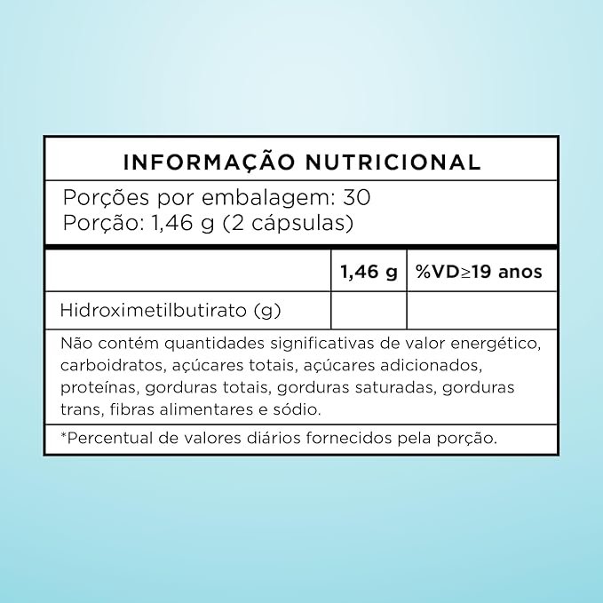 Aditivos Hidroximetilbutirato de Cálcio, etilcelulose, hidroxipropilmetilcelulose, estearato de magnésio, dióxido de silício e celulose microcristalina. NÃO CONTÉM GLÚTEN. Informações sobre alergia Não contém glúten, Não contém laticínios, Não contém leite, Não contém peixe Unidades 1 unidade Porção recomendada 2 cápsulas ao dia Marca Divina Pharma Formato Cápsula Descrição da faixa etária Adulto Número de unidades 60 Fabricante Sundown Dimensões do produto 7 x 7 x 12,5 cm; 70 g ASIN B09VYDJX6D Funciona a bateria ou pilha? Não EAN 7898966313271 - Dimensões do produto : 7 x 7 x 12,5 cm; 70 g
