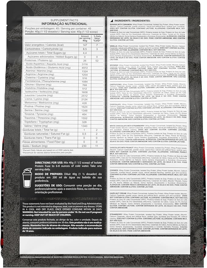 Com 5 tipos de proteína das mais nobres disponíveis como: Proteína Concentrada do Soro de Leite (WPC), Proteína Isolada de Soja, Proteína isolada do Soro do Leite (WPI), Clara do Ovo Desidratada (Albumina) e Caseinato de Cálcio. Todas com diferentes tempos de absorção pelo organismo, garantindo assim uma adequada ingestão proteica, ajudando a construir um corpo mais forte e definido. A utilização de blend proteico, como o Isolate Protein Fuse, oferece uma variedade de benefícios para quem busca uma alimentação saudável e um estilo de vida ativo, como o aumento da saciedade, a manutenção da massa muscular, a melhoria da recuperação após os treinos, o fornecimento de nutrientes essenciais e a redução do catabolismo muscular. Isolate Protein Fuse é rico em BCAAs e outros aminoácidos essenciais que podem proporcionar mais energia e força, garantindo um melhor desempenho, para auxiliar no volume e definição muscular.