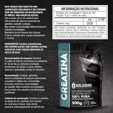 SUGESTÃO DE USO: A diluição recomendada é de 3g (2 dosadores) do produto em água ou sua bebida preferida até completa homogeneização. Ou como indicação profissional. INGREDIENTES: Creatina monohidratada e antiumectante dióxido de silício. NÃO CONTÉM GLÚTEN. ALÉRGICOS: PODE CONTER DERIVADOS DE OVO, LEITE E SOJA.