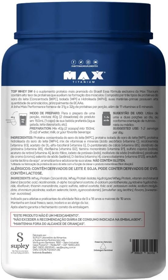 TOP WHEY 3W contém três tipos de proteínas do soro do leite: concentrada (WPC), isolada (WPI) e hidrolisada (WPH), matérias-primas com alta concentração de aminoAcidos, principalmente BCAA.Essas características dessa fórmula exclusiva da Max Titanium, torna um produto extraordinArio que auxilia na formação dos músculos e na recuperação muscular pós-treino. A linha Mais Performance fornece de 31g à 32g de proteínas por porção, contendo altas quantidade de aminoAcidos essenciais (BCAA) e também é fortificada com 11 vitaminas e 6 minerais. Além disso, o Top Whey 3W é o suplemento proteico mais premiado do Brasil.