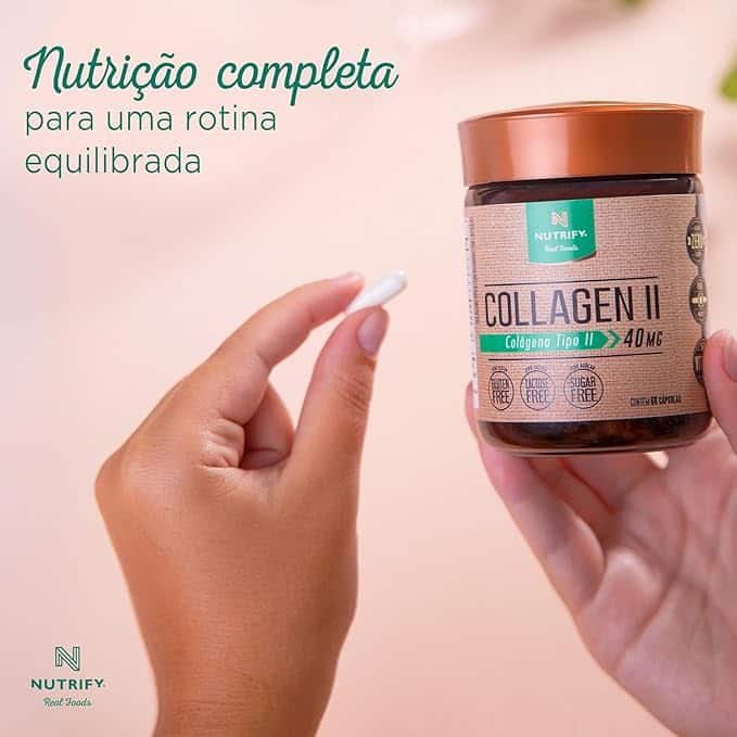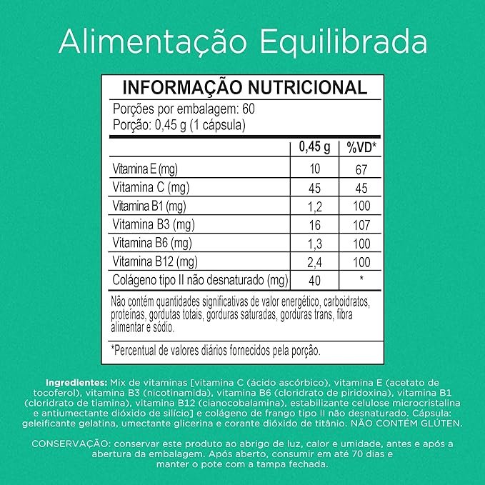 Ingredientes ‎Colágeno de frango tipo II, mix de vitaminas: [ácido ascórbico revestido (vitamina C), nicotinamida (vitamina B3), acetato de tocoferol (vitamina E), cloridrato de piridoxina (vitamina B6), mononitrato de tiamina (vitamina B1), cianocobalamina (vitamina B12)], estabilizantes amido e celulose microcristalina e antiumectante dióxido de silício. Composição da cápsula: gelatina, glicerina (umectante), água purificada e corante dióxido de titânio