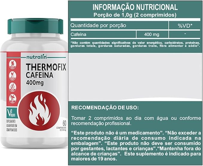 Descubra o Thermofix Cafeína da Nutralin, sua energia extra em um comprimido! Com 400mg de pura cafeína por dose, o Thermofix é seu aliado para ficar alerta e concentrado durante o dia. Ideal para momentos em que você precisa de um impulso extra, a cafeína auxilia no seu estado de alerta e na sua concentração. Além disso, o Thermofix Cafeína é perfeito para seus treinos, pois auxilia no aumento da capacidade de resistência e no desempenho de exercícios físicos de resistência. Aproveite o poder da cafeína de forma prática e eficaz com o Thermofix da Nutralin e mantenha-se ativo durante todo o dia!