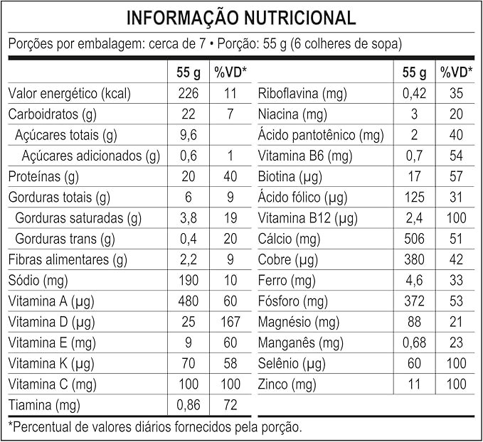 Leite integral, maltodextrina, proteína de soro do leite concentrada, proteína de soja isolada, polidextrose, caseinato de cálcio, colágeno hidrolisado, minerais (sais de magnésio do ácido cítrico, fosfato tricálcico, hidrogênio fosfato dipotássico, citrato de cálcio tetraidratado, pirofosfato férrico, sulfato de zinco, sulfato de manganês, sulfato cúprico e selenato de sódio), vitaminas (L-ascorbato de sódio, acetato de DL-alfa-tocoferila, nicotinamida, D-pantotenato de cálcio, cloridrato de piridoxina, tiamina mononitrato, acetato de retinila, riboflavina, ácido fólico, fitomenadiona, colecalciferol, D-biotina e cianocobalamina), reguladores de acidez citrato de potássio, hidróxido de potássio e ácido cítrico e emulsificante lecitina.
