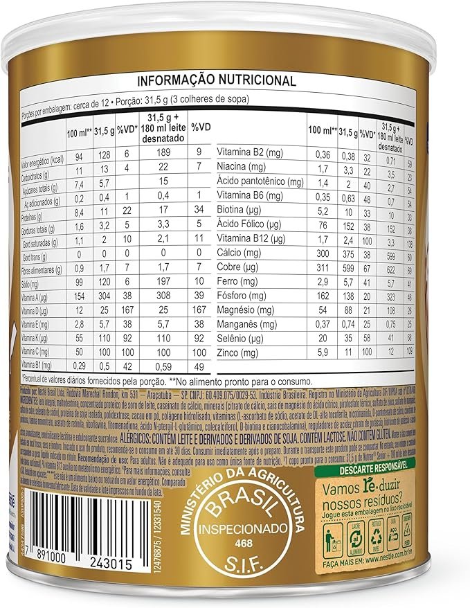 Leite integral, maltodextrina, concentrado proteico de soro de leite, caseinato de cálcio, minerais (citrato de cálcio, sais de magnésio do ácido cítrico, pirofosfato férrico, sulfato de zinco, sulfato de manganês, sulfato de cobre e selenato de sódio), proteína de soja isolada, polidextrose, cacau em pó, colágeno hidrolisado, vitaminas (L-ascorbato de sódio, acetato de DL-alfa-tocoferila, nicotinamida, D-pantotenato de cálcio, cloridrato de piridoxina, tiamina mononitrato, acetato de retinila, riboflavina, fitomenadiona, ácido N-pteroil-L-glutâmico, colecalciferol, D-biotina e cianocobalamina), reguladores de acidez citrato de potássio, hidróxido de potássio e ácido cítrico, aromatizantes, emulsificante lecitina e edulcorante sucralose.
